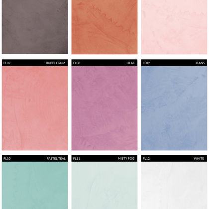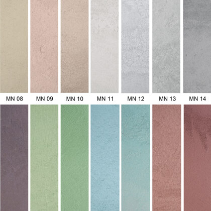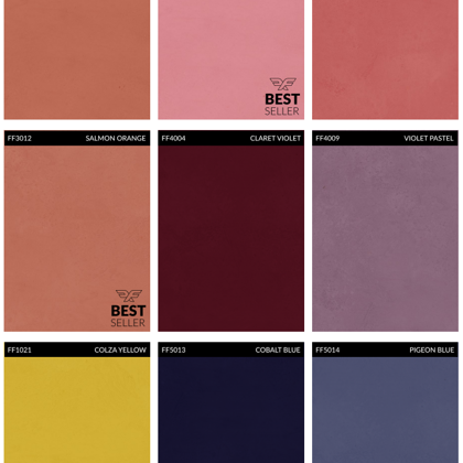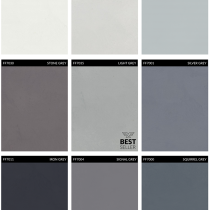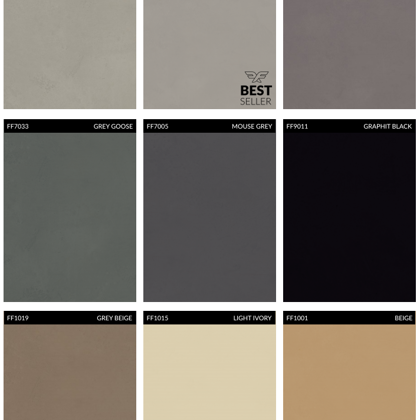 A mikrocement széles színválasztékban kapható. Az alábbiakban a legnépszerűbb színek találhatók a szabványos palettáról. Ezen kívül bármilyen szín rendelhető a RAL palettáról (több mint 200 árnyalat) és az NCS palettáról (majdnem 2000 árnyalat).